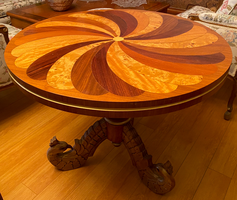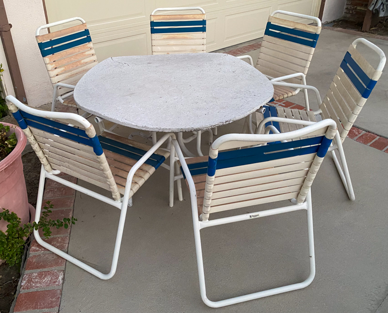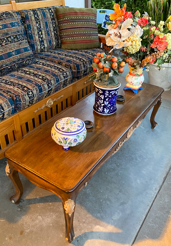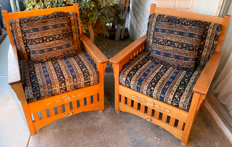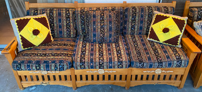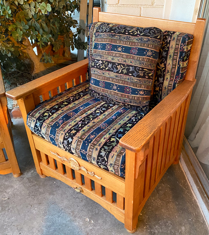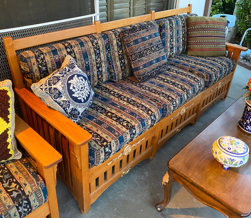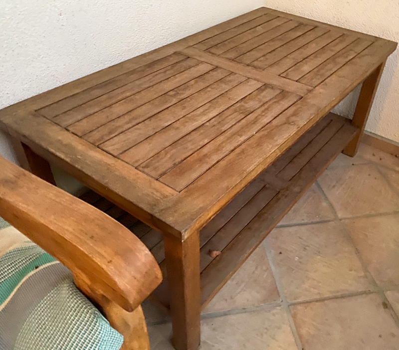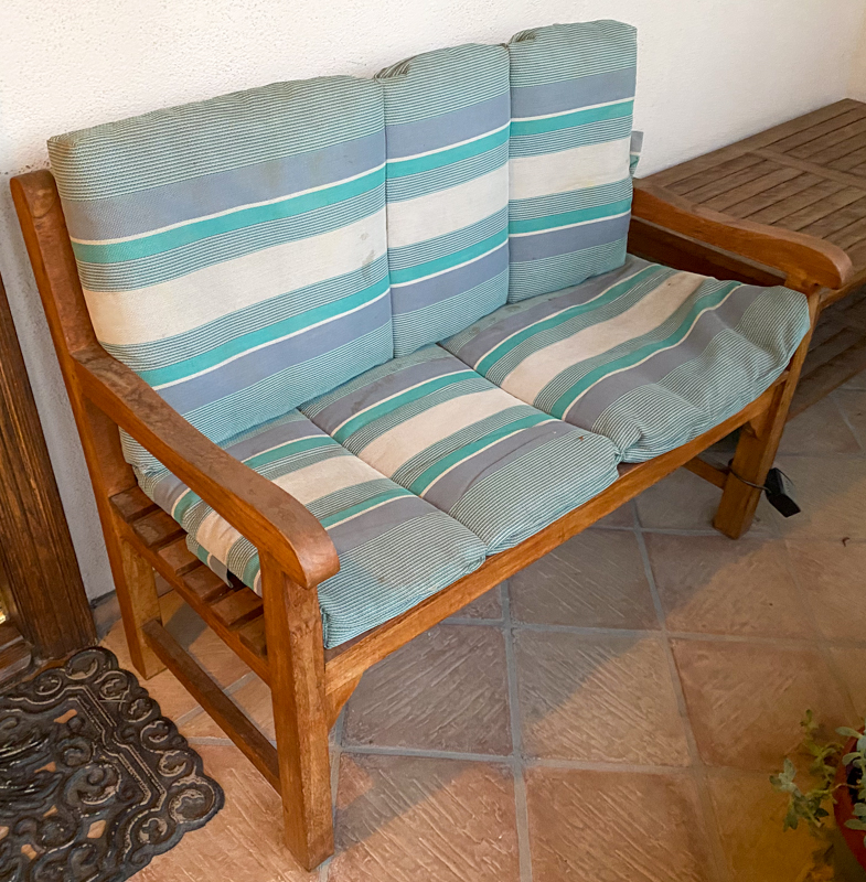 - Teak and oak outdoor furniture w/ custom upholstered cushions